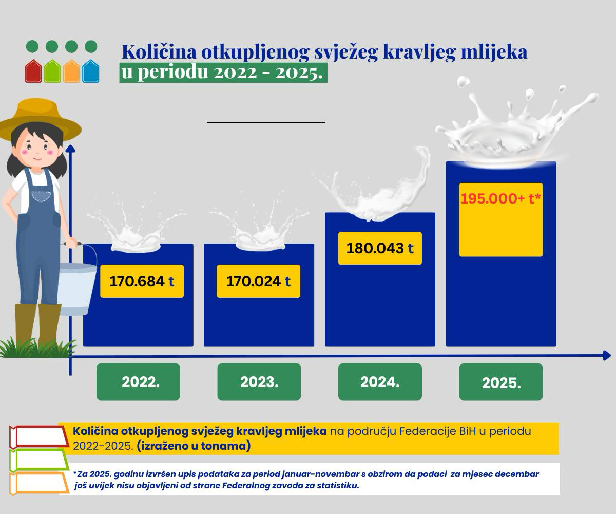 Količina otkupljenog mlijeka u Federaciji BiH rasla je najmanje 14,25 posto u posljednje dvije godine, sa nešto više od 170.000 tona otkupljenog mlijeka u 2022. i 2023. godini na 180.043 tone u 2024. godini, i najmanje 195.000 tona u 2025. godini, što su rekordne količine, rekao je federalni ministar poljoprivrede, vodoprivrede i šumarstva Kemal Hrnjić.